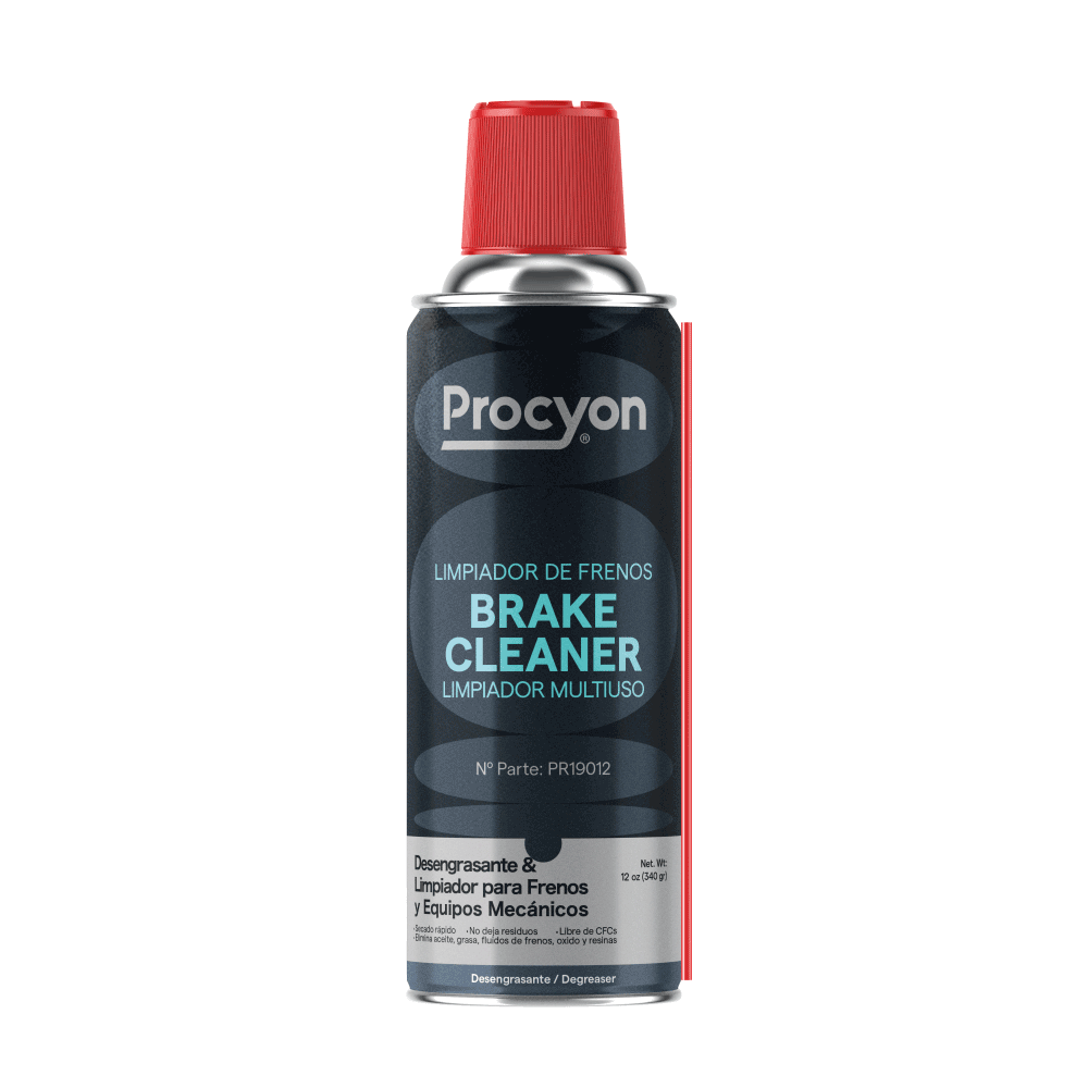 PROCYON® BRAKE CLEANER está especialmente diseñado para eliminar aceite, grasa, fluidos de freno, aceites oxidados (resinas) y asfalto de todo tipo de frenos, conjuntos de frenos y piezas metálicas. Penetra a través de la suciedad y la corrosión y las elimina, evitando la necesidad de desmontar las piezas. No deja residuos y se seca rápidamente.