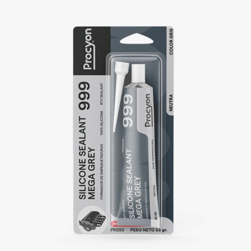 PROCYON® SILICONE SEALANT MEGA GREY 999 Formador de Juntas o Empaquetaduras, Sellador de silicona RTV mono componente de curado neutro, de alta performance, no corrosivo y de bajo olor. Soporta temperaturas de operación muy altas hasta 350°C (650 °F) . Tiene excelentes propiedades de adhesión a la mayoría de los materiales, superficies vidriadas, cerámica, esmalte, madera impregnada y pintada.