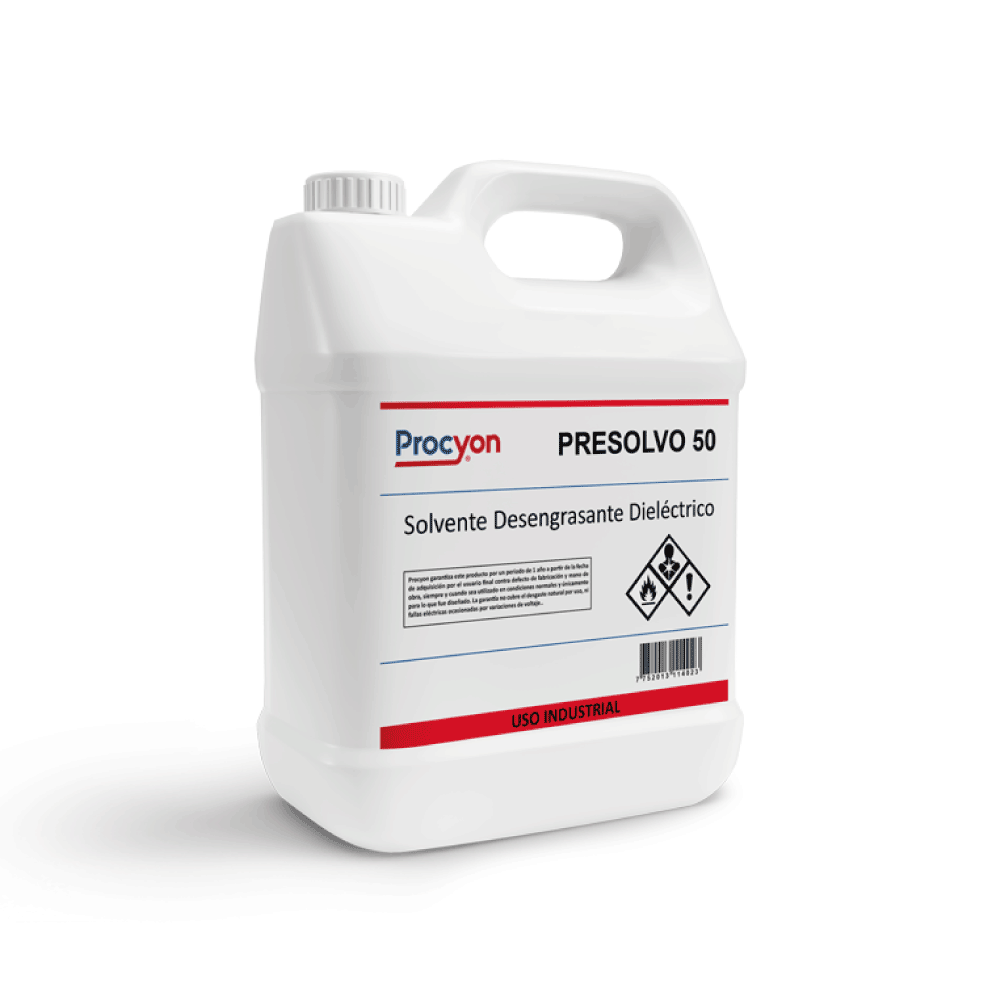 PROCYON® PRESOLVO 50 es un solvente desengrasante dieléctrico biodegradable de grado industrial, formulado a base de solventes alifáticos, hidrotratados y refinados. Además es usado principalmente para la limpieza y desengrase de equipos eléctricos, electrónicos y mecánicos. Es un producto que no posee solventes clorados, que da la característica de ser un solvente desengrasante dieléctrico biodegradable y ecológico de rigidez dieléctrica elevada y seguro para ser usado en plantas industriales. Por consiguiente es fácilmente hidrolizado por los microorganismos ambientales, entrando rápidamente a la cadena biológica y degradándose. Es por eso que el producto Procyon Solvo Cleaner 100 también es usado en equipos de lavado y de evaporación moderada lo que permite penetrar en partes inaccesibles de los equipos, asimismo, este producto se puede usar como un limpiador previo a un solvente dieléctrico en la limpieza de motores.