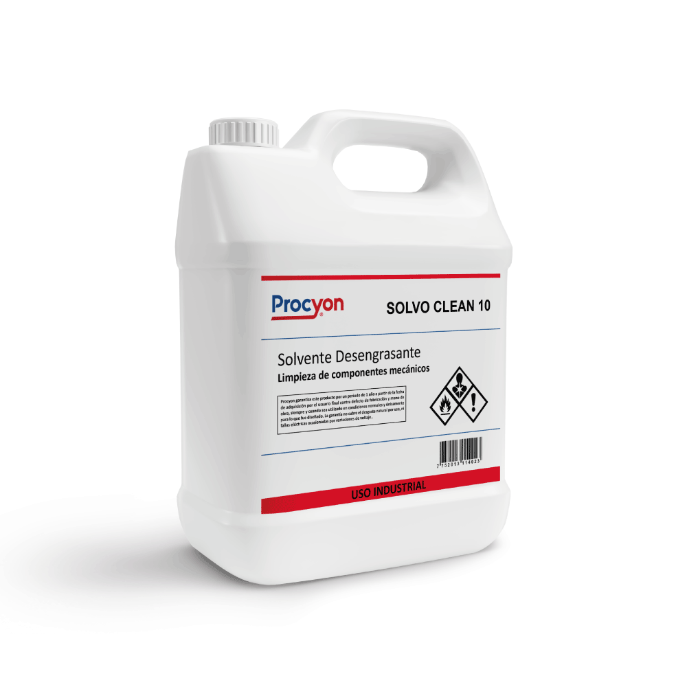 PROCYON® SOLVO CLEANER 10 Desengrasante para limpieza de piezas mecánicas, de bajo contenido de compuestos aromáticos, que le confiere la cualidad de ser un producto de baja toxicidad que posee un elevado grado de solvencia sobre las superficies sucias con grasas, aceites, ceras, gomas y otros. contaminantes.